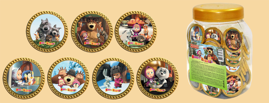 Шоколад фигурный молочный ШОКОЛАДНАЯ МОНЕТА-МАША И МЕДВЕДЬ (МАША И ДРУЗЬЯ) с коллекционной этикеткой (9туб х 100шт)