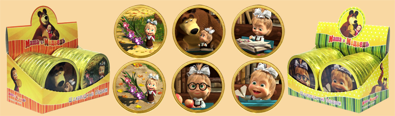 Шоколад фигурный молочный ШОКОЛАДНАЯ МЕДАЛЬ-МАША И МЕДВЕДЬ (ШКОЛА) (6бл. х 24шт)